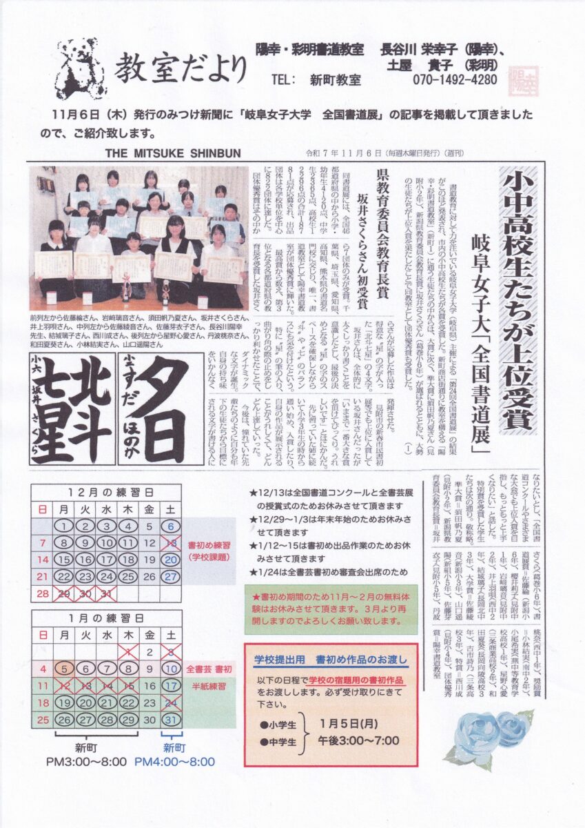 みつけ新聞(11月6日発行)に掲載されました(岐阜女子大学 全国書道展)、12月・1月カレンダー